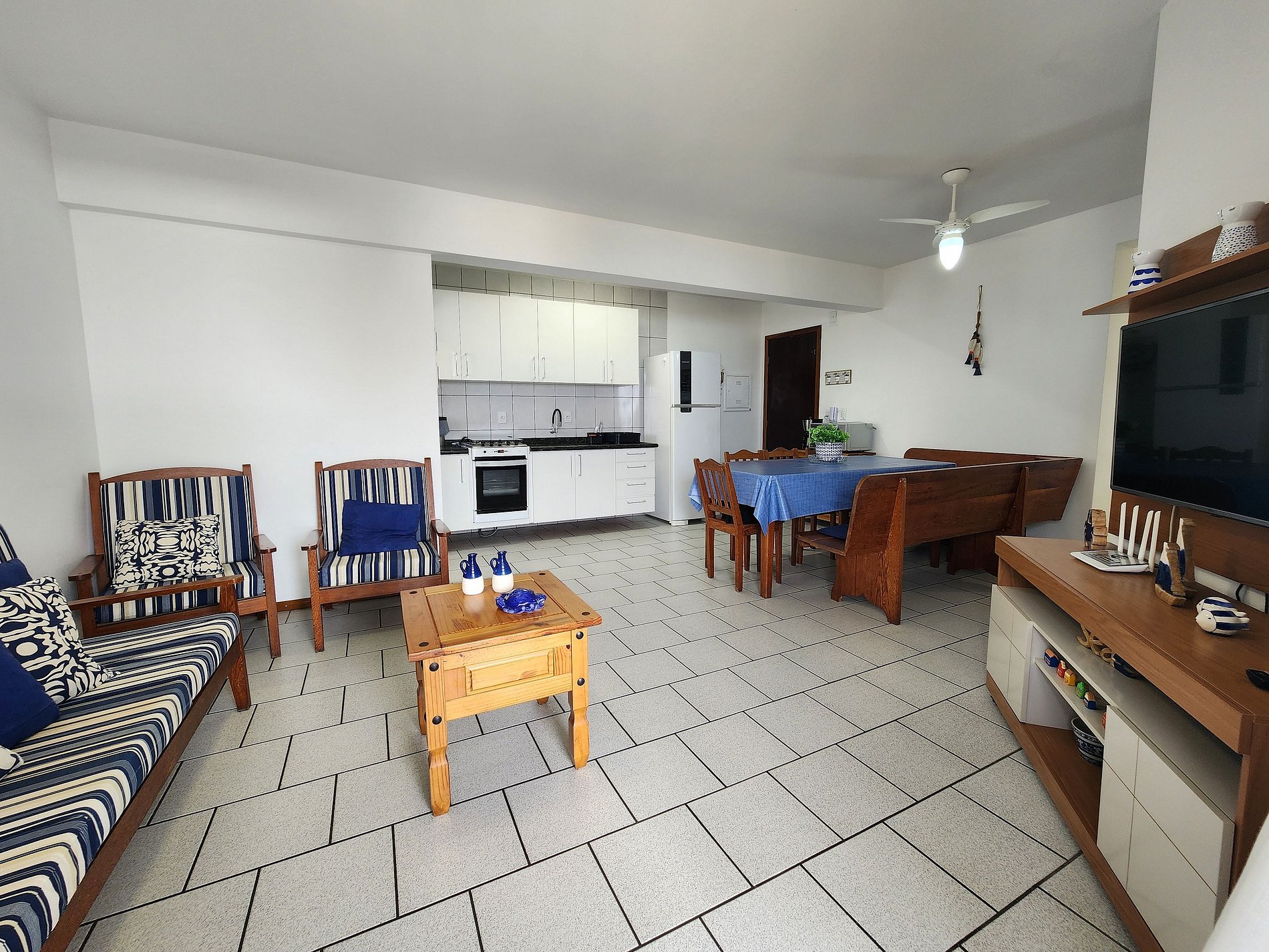 Sala ampla e decorada com um charmoso estilo praiano